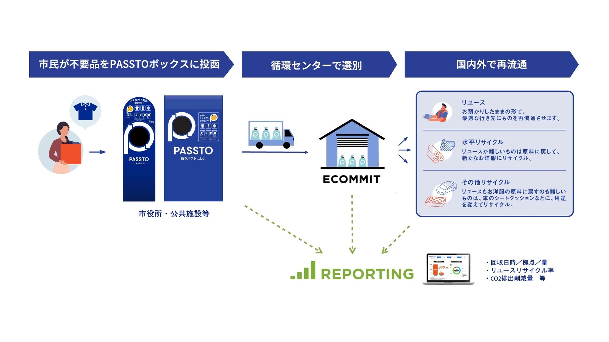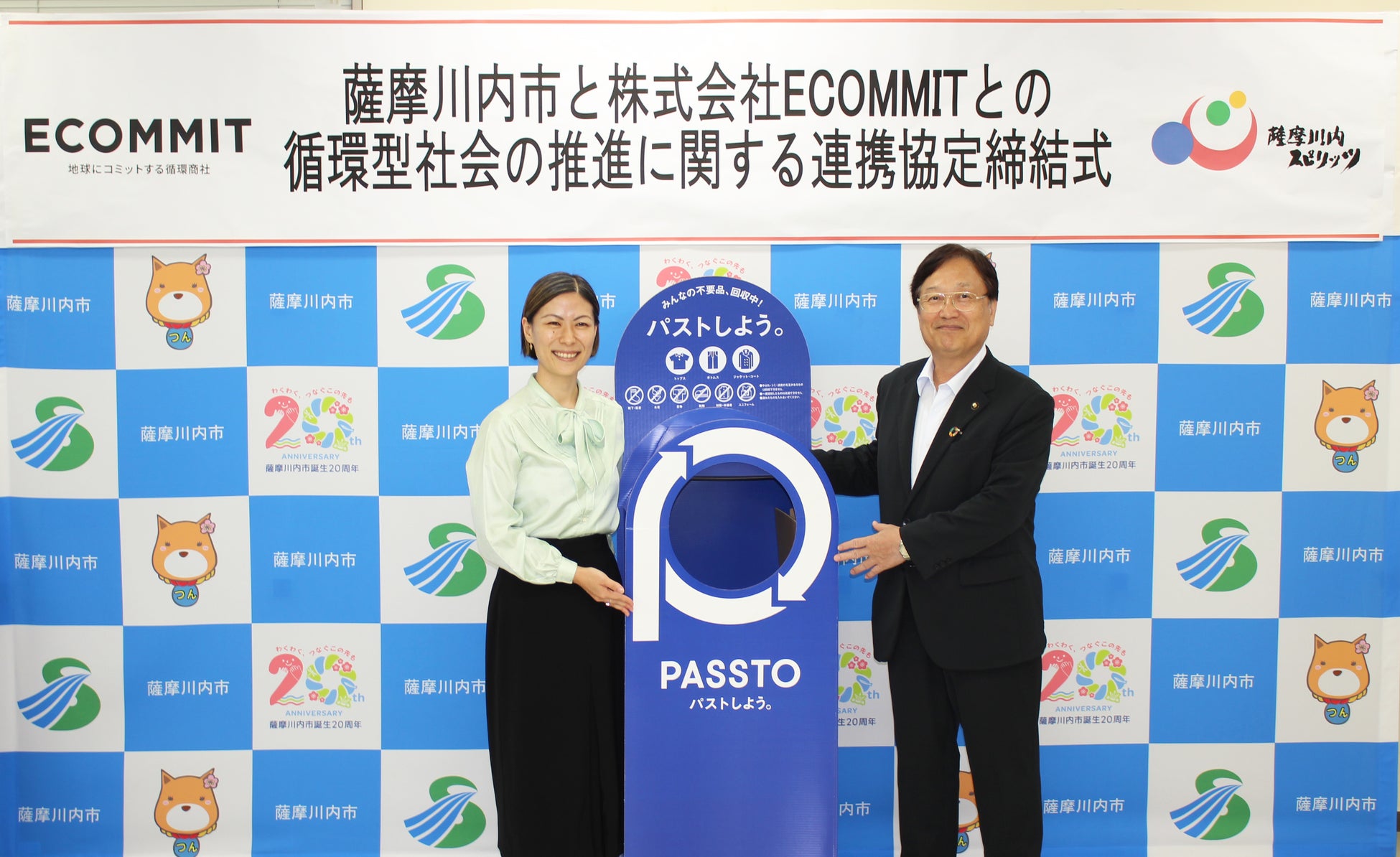 本協定により、ECOMMITが運営する資源循環サービス「PASSTO(パスト)」の不要品回収ボックスを薩摩川内市内の市役所をはじめとした公共施設の7拠点に設置し、ご家庭で不要になった衣類を廃棄するのではなく、リユースやリサイクルへと繋げる仕組みを提供することで、地域全体で資源循環に取り組みます。