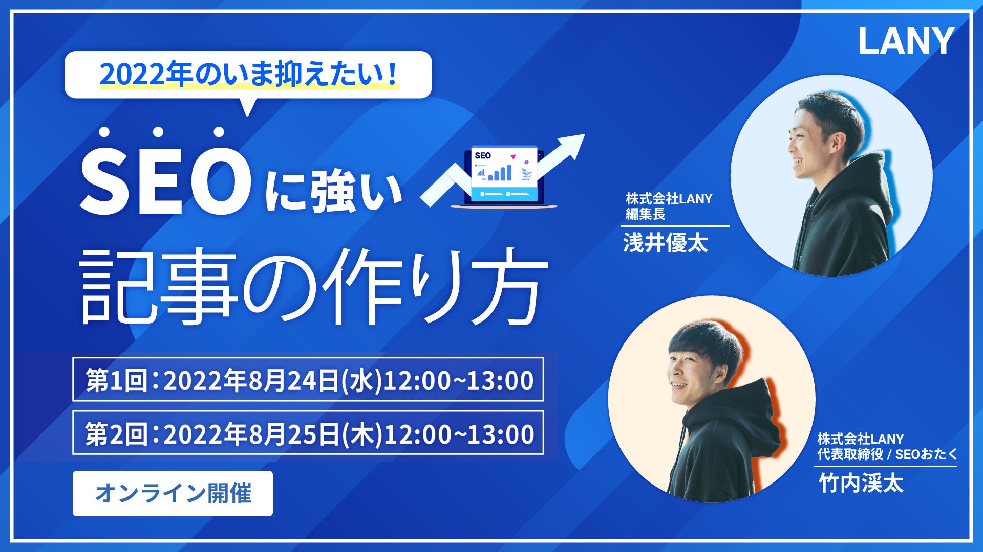 SEOコンサルティングを提供する株式会社LANY(東京都渋谷区、代表取締役社長:竹内渓太)は、2022年のいま抑えたい!SEOに強い記事の作り方について解説するウェビナーを2022年8月24日(水)、8月25日(木)に開催いたします。