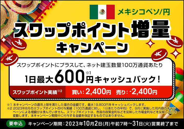 新規約定したメキシコペソ/円の建玉1万通貨(ネット建玉数量)ごとに1日6円キャッシュバック!