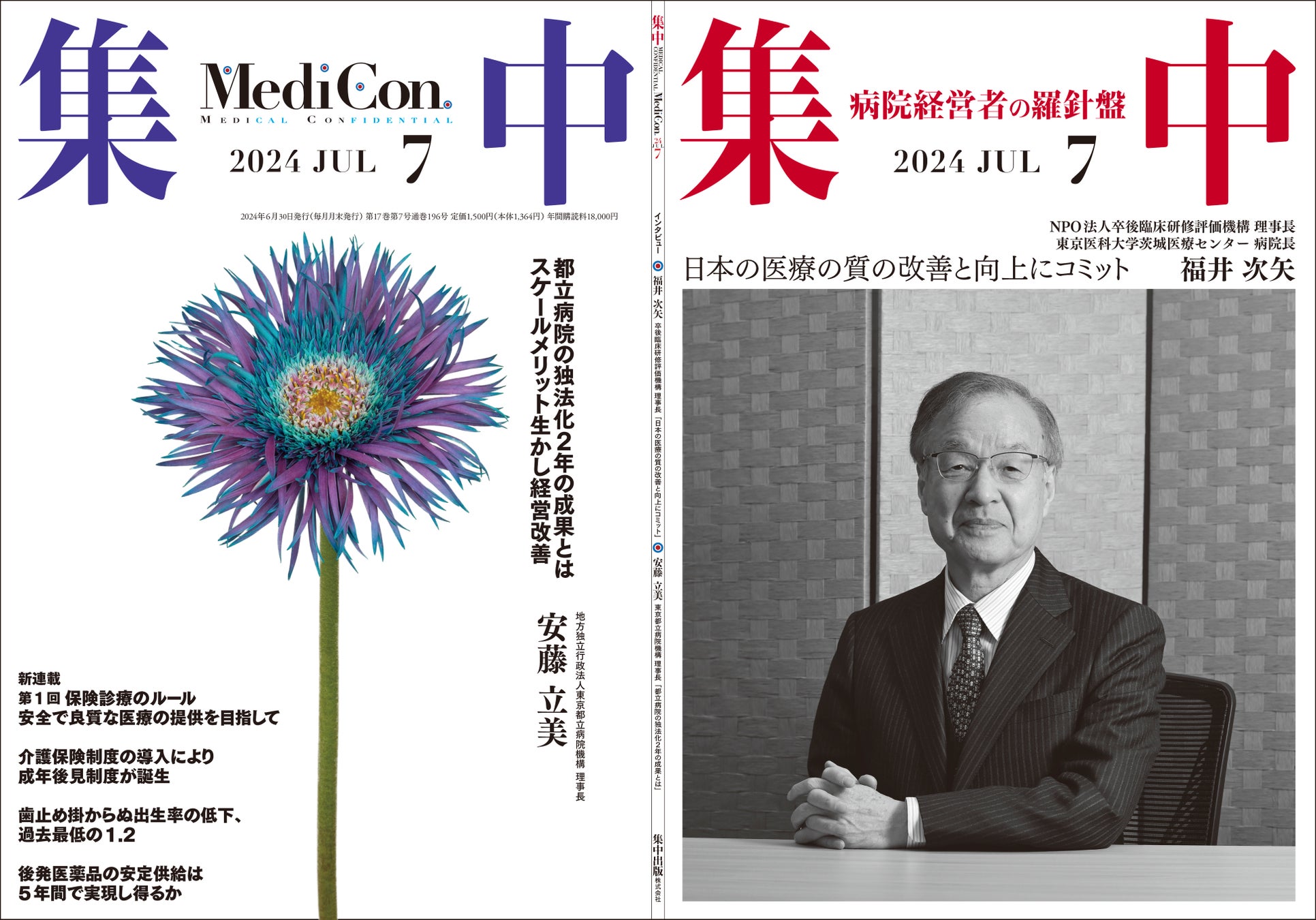 2008年創刊の医療情報誌・月刊『集中』(B5/毎月1日・50,000部発行)は、病院経営者や医師の為の情報誌として、厚生行政、医薬品、医療機器企業の動向等、病院の経営に役立つ医療情報を提供しています。また弊社は、日本の医療が抱える諸問題について毎月テーマを挙げ、国会議員団・医療機関経営者・医療関連企業の幹部の皆様が集い、情報交換をする定例勉強会「日本の医療の未来を考える会」を主催しています(医療従事者は参加費無料/2024年1月現在登録者約2,000名)。今回の勉強会は、東京都健康長寿医療センター保険指導専門部長・東京医科大学病院医療保健室客員教授の葦沢龍人先生を講師に迎え、今年度の診療報酬改定で新しく提案された地域包括医療病棟の導入を含め、ケアミックスの考え方を中心にお話し頂きます。ケアミックスの運用は、入院患者データに基づき詳細に実施されるべきものです。保険診療のルール(特に施設基準)と患者データを合わせ、ケアミックス病院の収益アップに結び付くノウハウについてお話し頂きます。ぜひご出席ください。