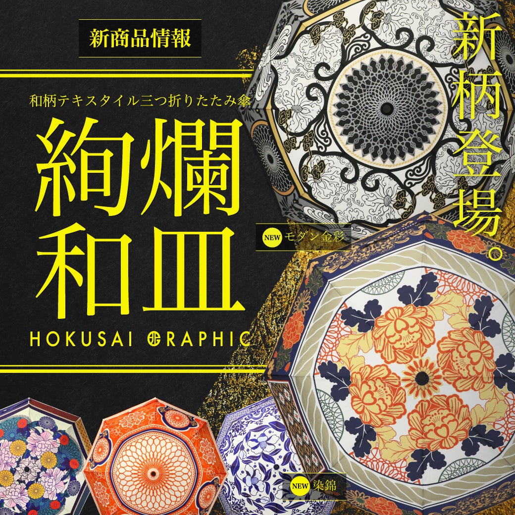 和柄傘ブランド「北斎グラフィック」より、絢爛和皿シリーズの新作折りたたみ傘の発売を開始しました。大胆でモダンな和柄のグラフィックデザインを施した晴雨兼用折りたたみ傘です。骨組みに合わせて柄を職人による手作業でつなぎ合わせており、繋ぎ目も綺麗です。また和装、洋装問わずお使いいただけるように、折畳み傘でも後ろ帯が濡れない大きめの傘にしました。