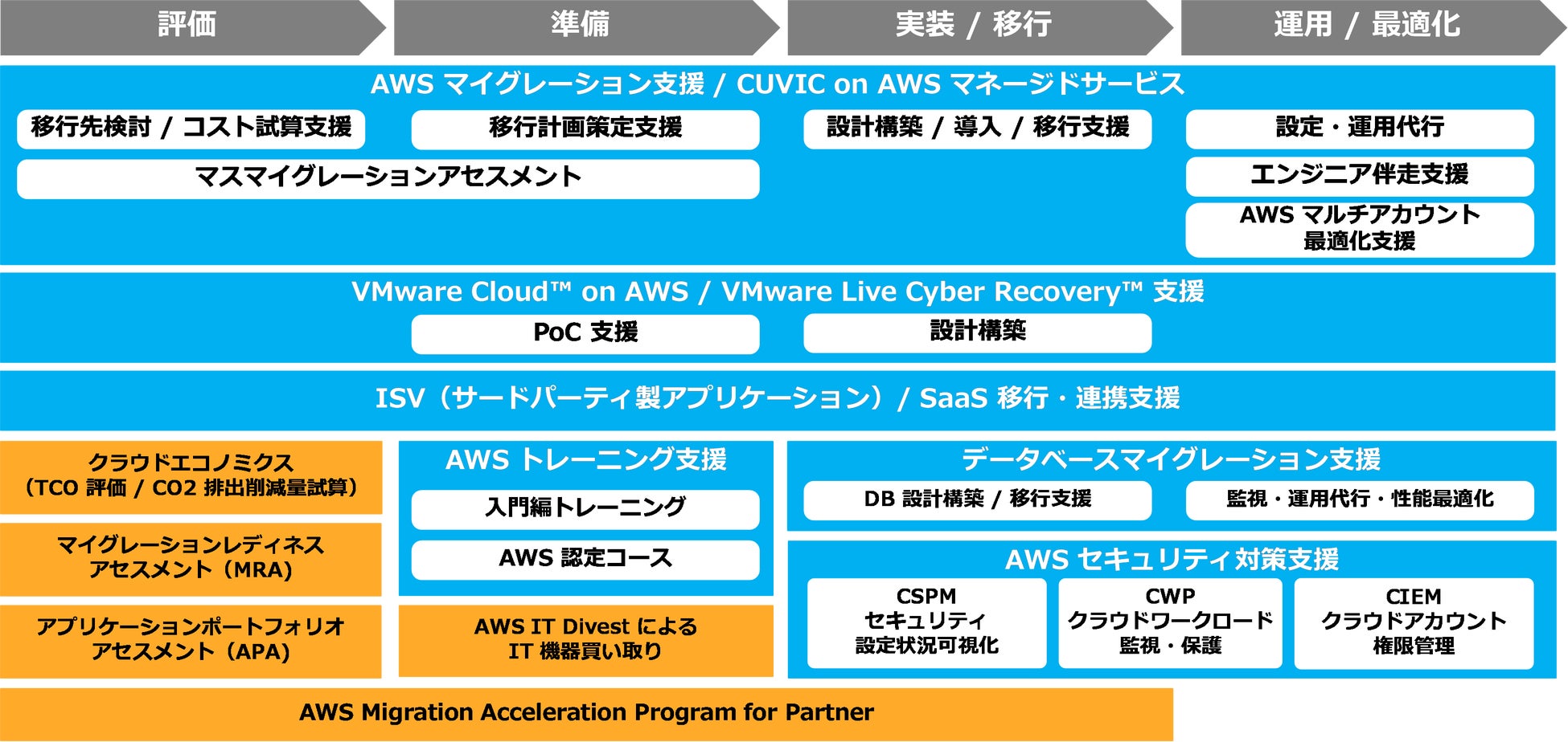 CTCは、2011年からAWS移行の方針・計画の策定、実行、運用までの一貫した支援を行っています。今回CTCはAWSジャパンが提供するTCOやCO2排出量の削減効果を試算する「クラウドエコノミクス」、クラウド移行の準備状況の現状分析と推奨アクションを提案する「マイグレーションレディネスアセスメント(MRA)」、移行対象システムを分析し、システム特性に応じた戦略的なクラウド移行パターンの推奨を行う「アプリケーションポートフォリオアセスメント(APA)」を活用して、企業の大規模なクラウド移行やハイブリッド環境への移行の支援サービスを強化しました。ITX for MCP CTC OneCUVIC Mass Migrationは、大規模なクラウド移行における運用統合管理サービスや適切な権限管理とガイドラインの策定を行い、移行後のセキュリティとガバナンスの強化を含めトータルでサポートします。