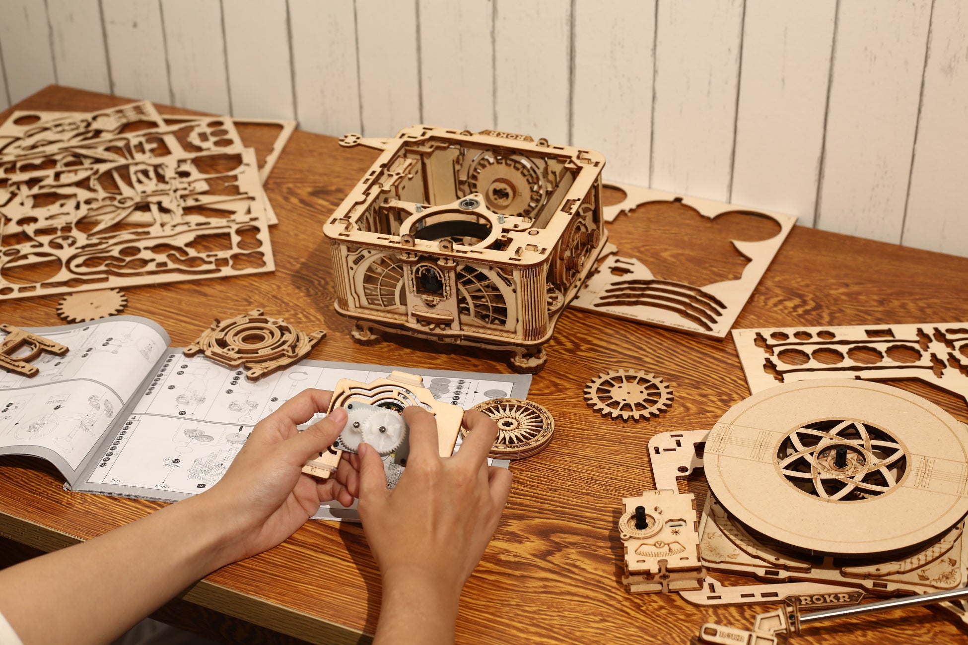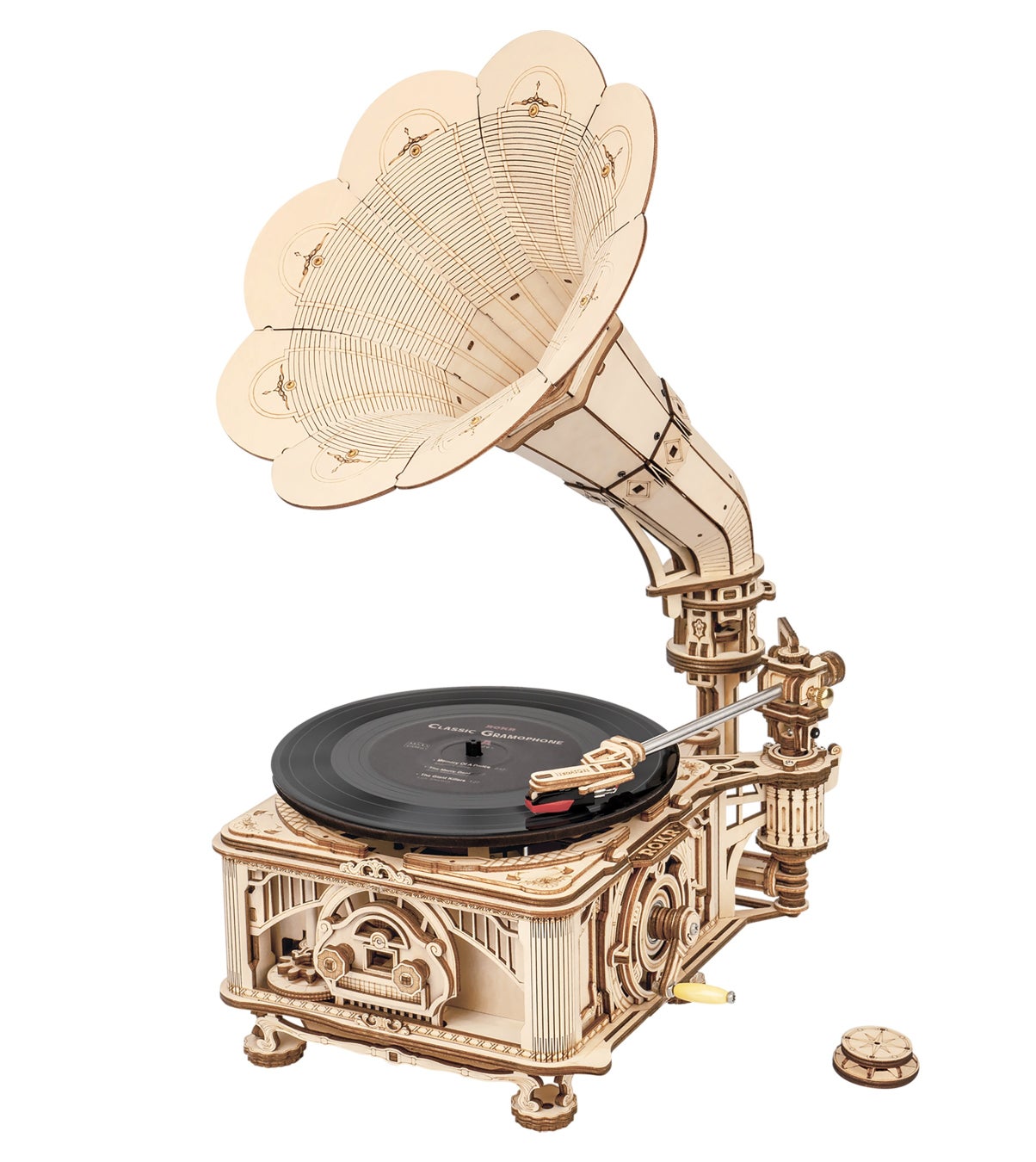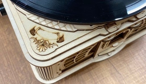 1880年代ごろに流通していた、蓄音機のデザインを思わせるようなアンティークなホーン付き。側面は複数のパーツ×焼きで、非常に細かなデザインとなっています。また、レコード盤の回転速度(回転数)や、音楽のボリューム調節ができるなど、リアルさへのこだわりが細部にまで詰まったウッドパズルです。部屋のインテリアとしても魅力的で、飾ると雰囲気ある空間になります。
