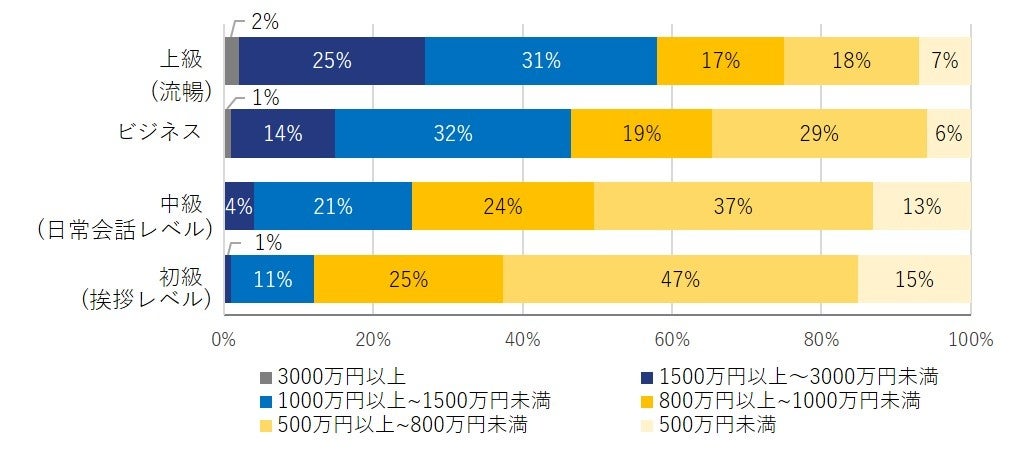 人材紹介・人材派遣会社のエンワールド・ジャパン社が2020年1~2月に行った調査(※1)によると、英語のレベルが上がるほど年収の高い割合が大きくなる相関関係がみられています。特に、英語力が「上級」(流暢)の人は年収1000万円以上が約60%というデータもあり、英語力は年収に直結する大きな武器であると言えるでしょう。