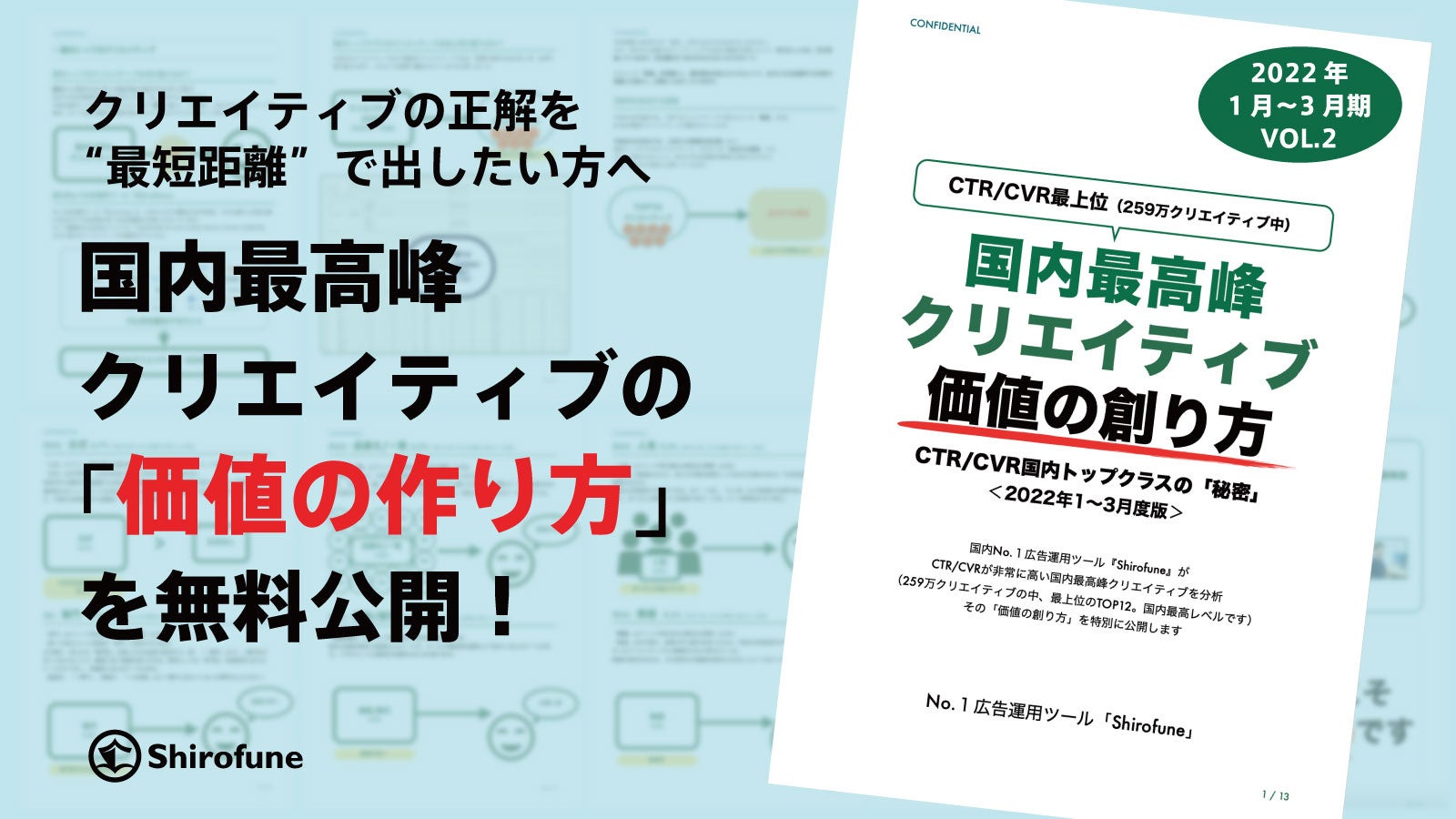 広告運用自動化ツール「Shirofune」は、広告運用者向けのお役立ち資料として『259万本を徹底分析!CTR・CVR最上位の国内最高峰クリエイティブの”価値の創り方” 』を無料公開します。
