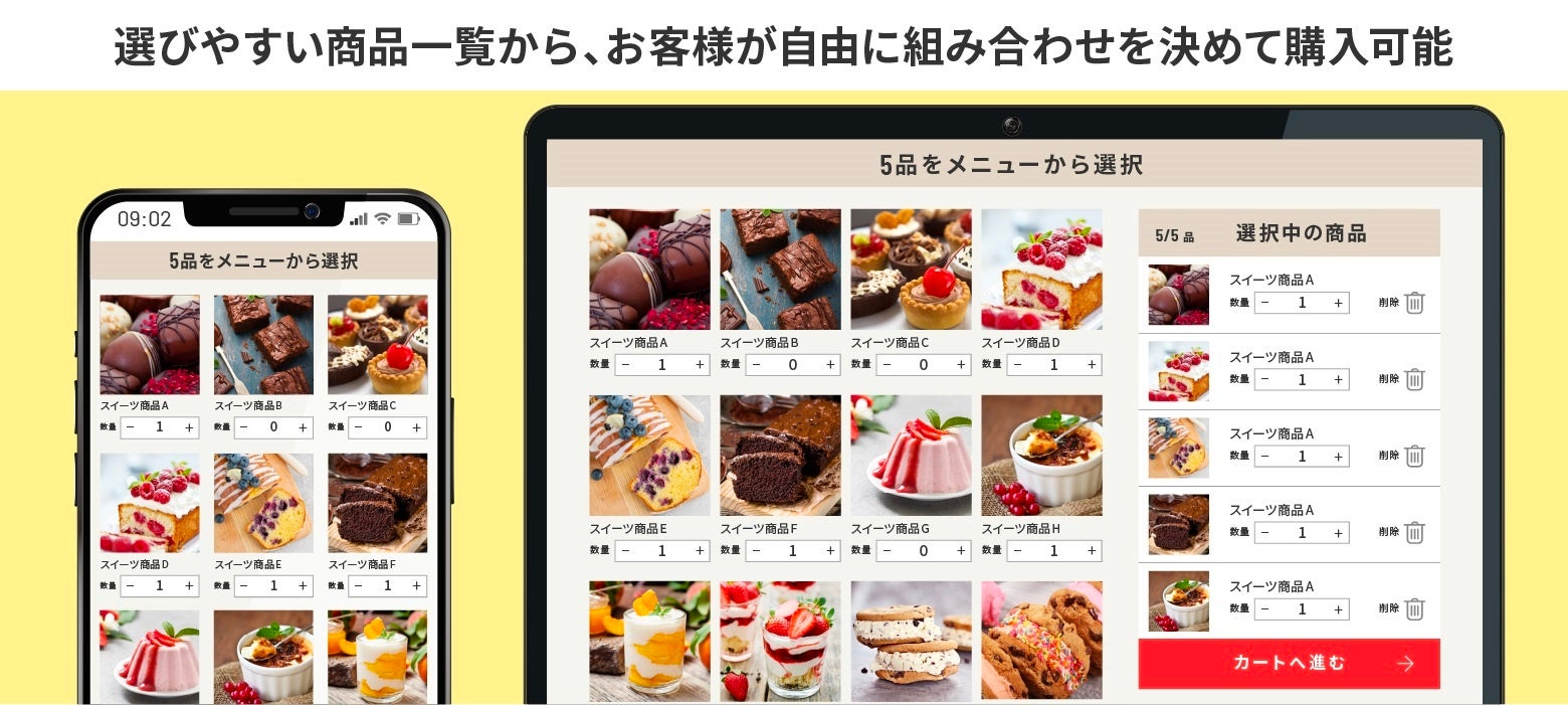 新しい商品選択画面は、お客様の操作のしやすさを重視し、商品説明、商品画像、個数、価格を分かりやすく配置しました。お客様は、購入商品の個数や価格の計算の手間を最小限に抑え、直感的に商品を選択しスムーズにお買い物をお楽しみいただけます。