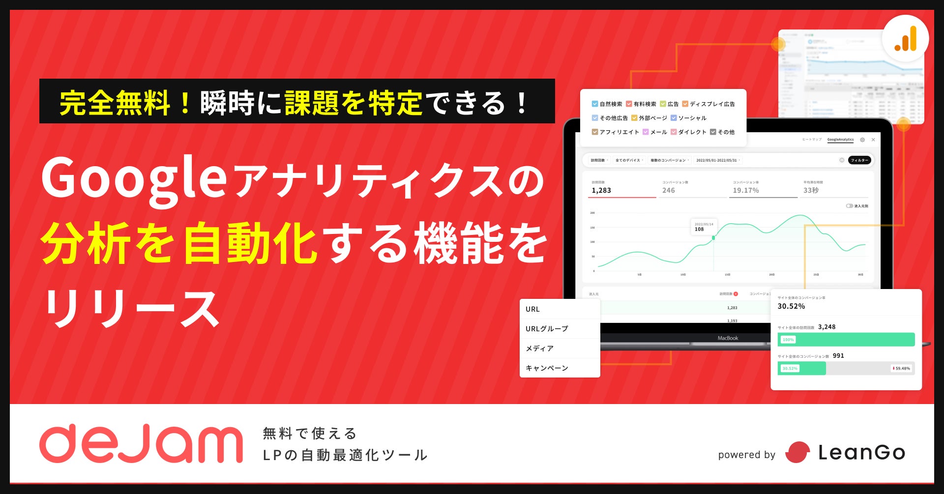 【完全無料】Googleアナリティクスの分析を自動化する機能をリリース | WebサイトやLPの自動最適化ツール「dejam」のアップデート情報をご報告