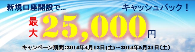 SBI FXトレードが提供する外国為替証拠金取引「SBI FXTRADE」は、2014年4月12日(土)より、最大25,000円の新規口座開設キャッシュバックキャンペーンを実施いたしますのでお知らせいたします。