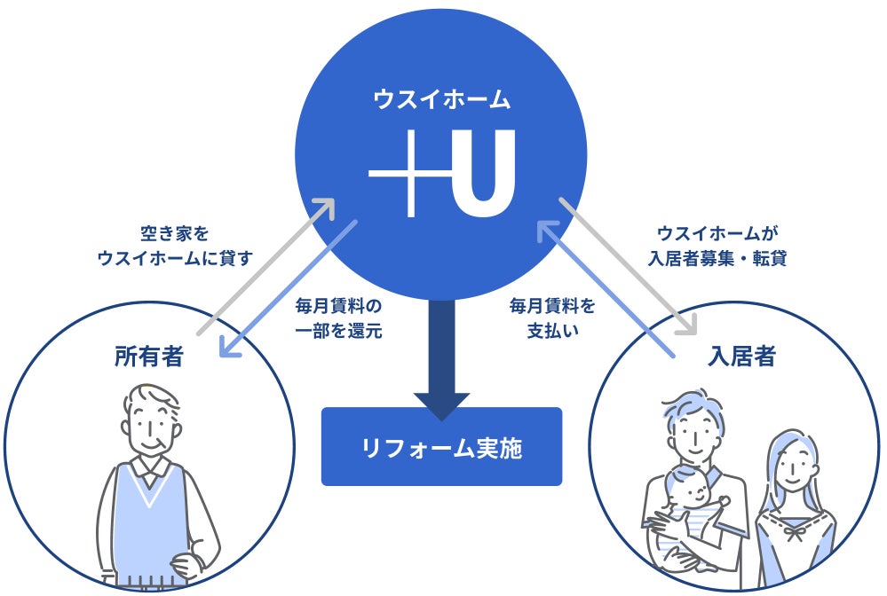 不動産賃貸管理・不動産賃貸仲介・リフォームを一社で手掛けているウスイホームが所有者から空き家を借り受け、ウスイホームが費用全額負担でリノベーション工事を行い入居者へ転貸(サブリース方式)するサービスです。