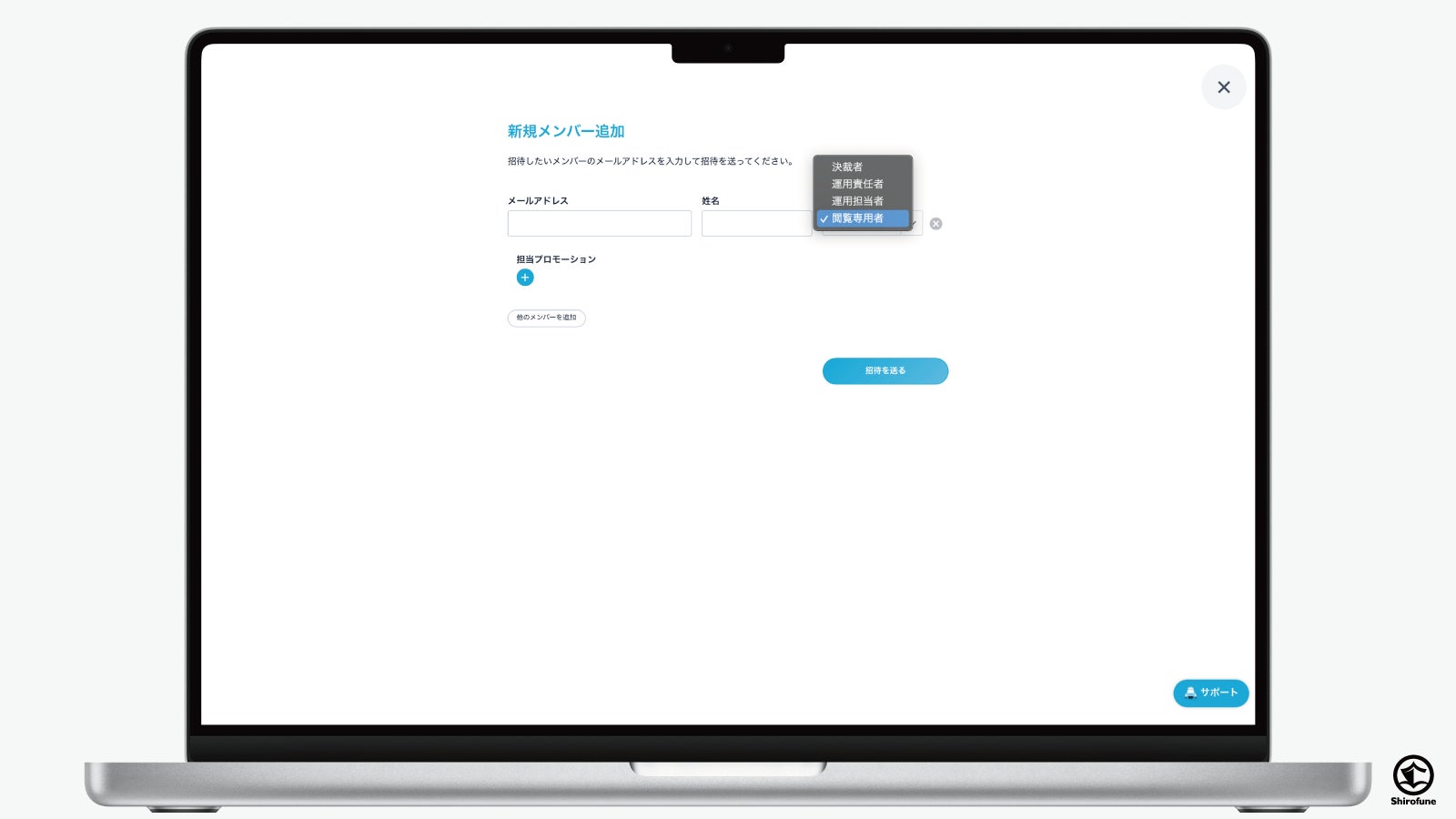 - メールアドレス・姓名を記入後、役割を「閲覧専用者」にして招待を送信。
