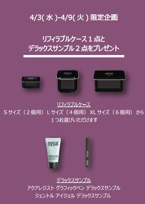 4月3日(水)から9日(火)のイベント期間中、アーティスト シャドウを含む税込11,000円以上ご購入のお客様にリフィラブルケース1点とデラックスサンプル2点をプレゼント。