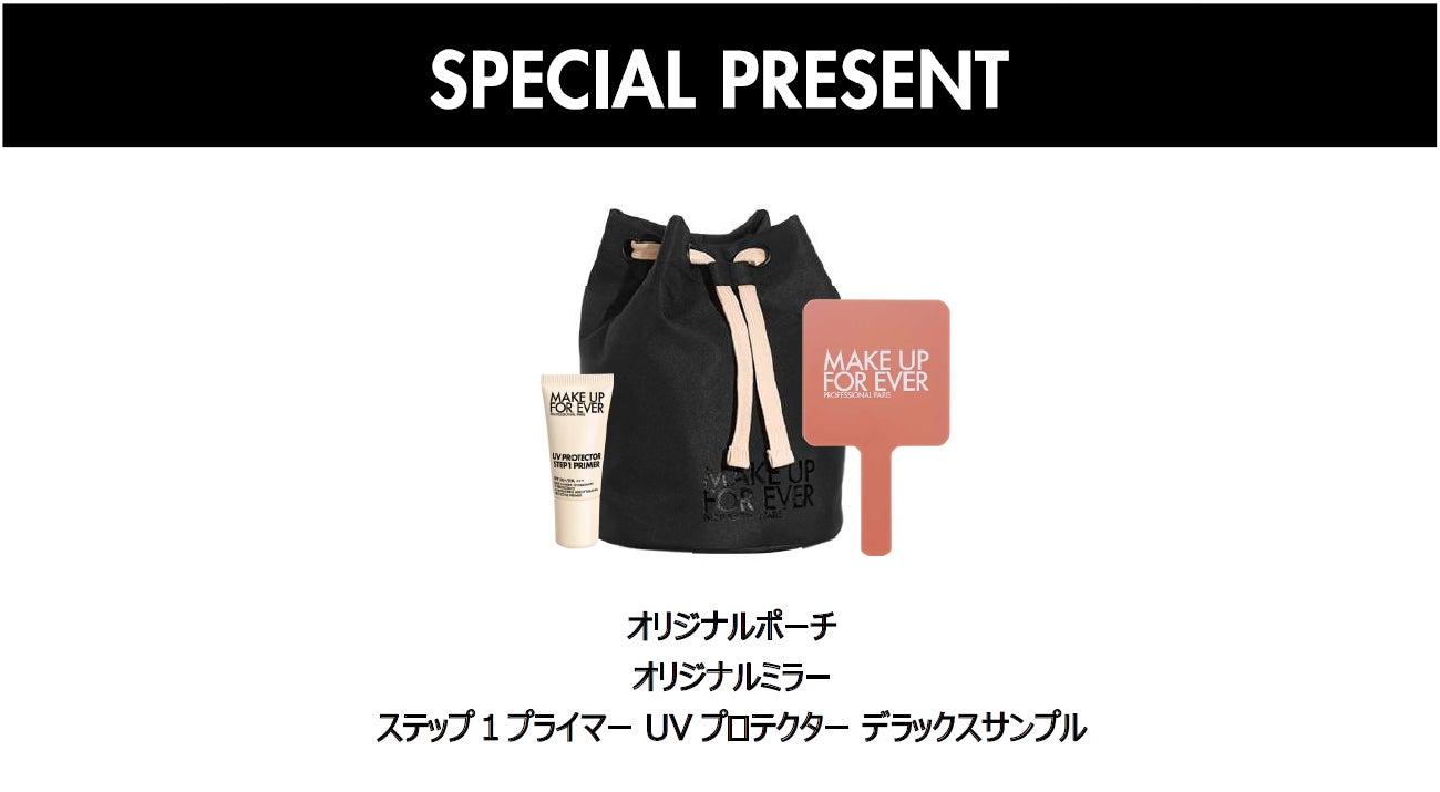 阪急うめだ本店限定 選べるキットをお買い上げのお客様には、紫外線から肌を守りながら、ツヤと潤いのある仕上がりが叶うメイク下地「ステップ1プライマー UVプロテクター」のデラックスサンプルとオリジナルミラー、さらにオリジナルポーチをプレゼントいたします。