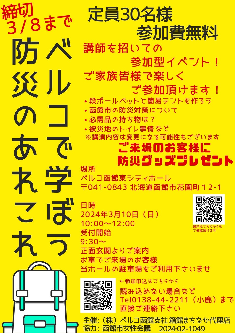 【株式会社ベルコ】3月10日函館で防災セミナー「ベルコで学ぼう 防災のあれこれ」を開催・ご来場のお客様に防災グッズプレゼント