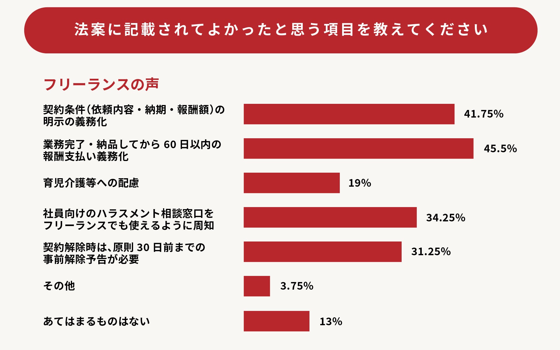 法案に記載されてよかった項目TOP3は「60日以内の報酬支払」「契約条件明示の義務化」「ハラスメント窓口の利用」