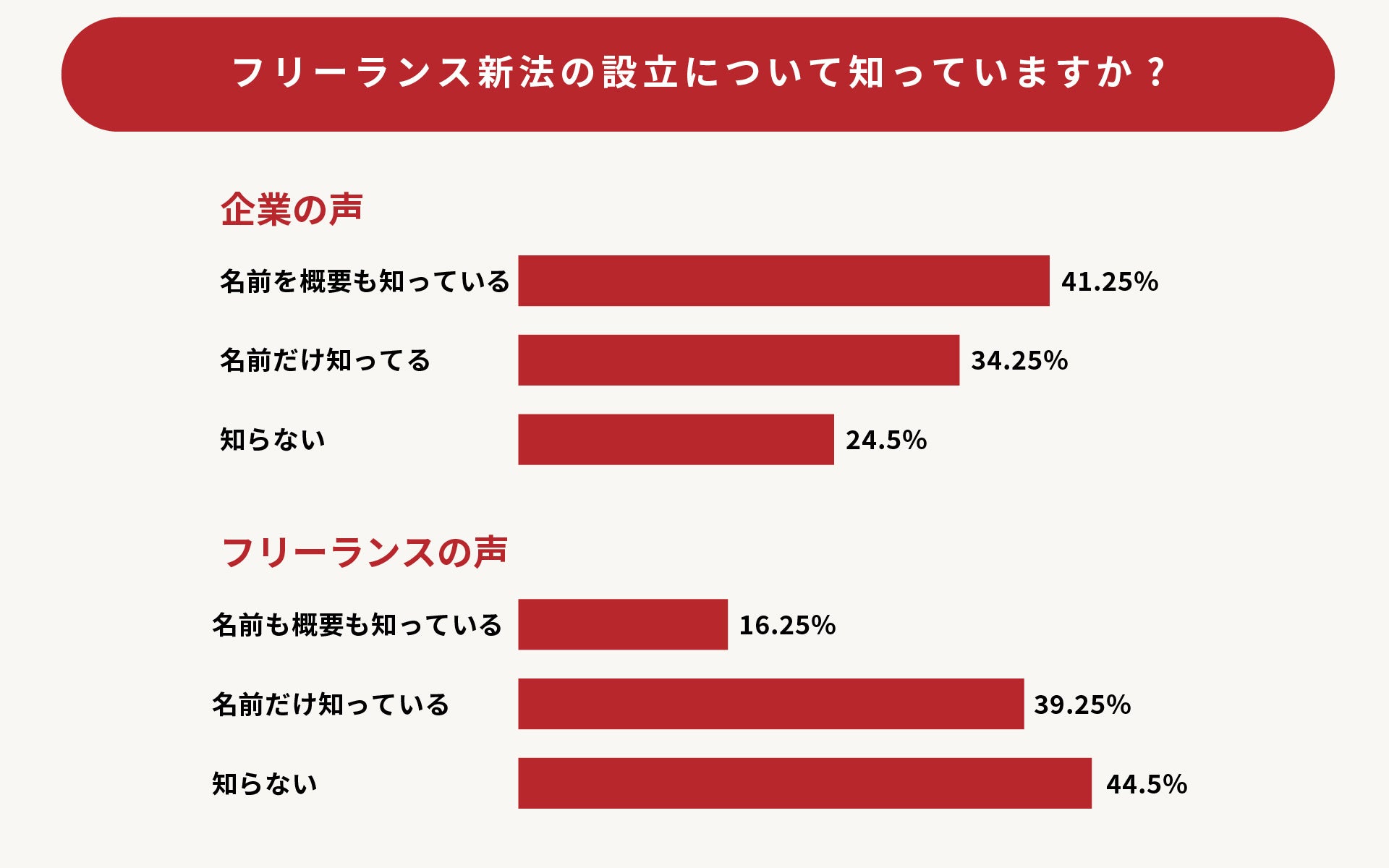 また、トラブル経験のあるフリーランスのうち55.5%のみが同法について認知しているという結果が出ました。これは企業側の75.5%という認知度と比べて大きなギャップがあることを示しています。この点をさらに細かく見ると、「フリーランス新法について名前も概要も知っている」と回答したトラブル経験のあるフリーランスは16.25%で、企業担当者の41.25%と比べると2倍以上の開きがあります。