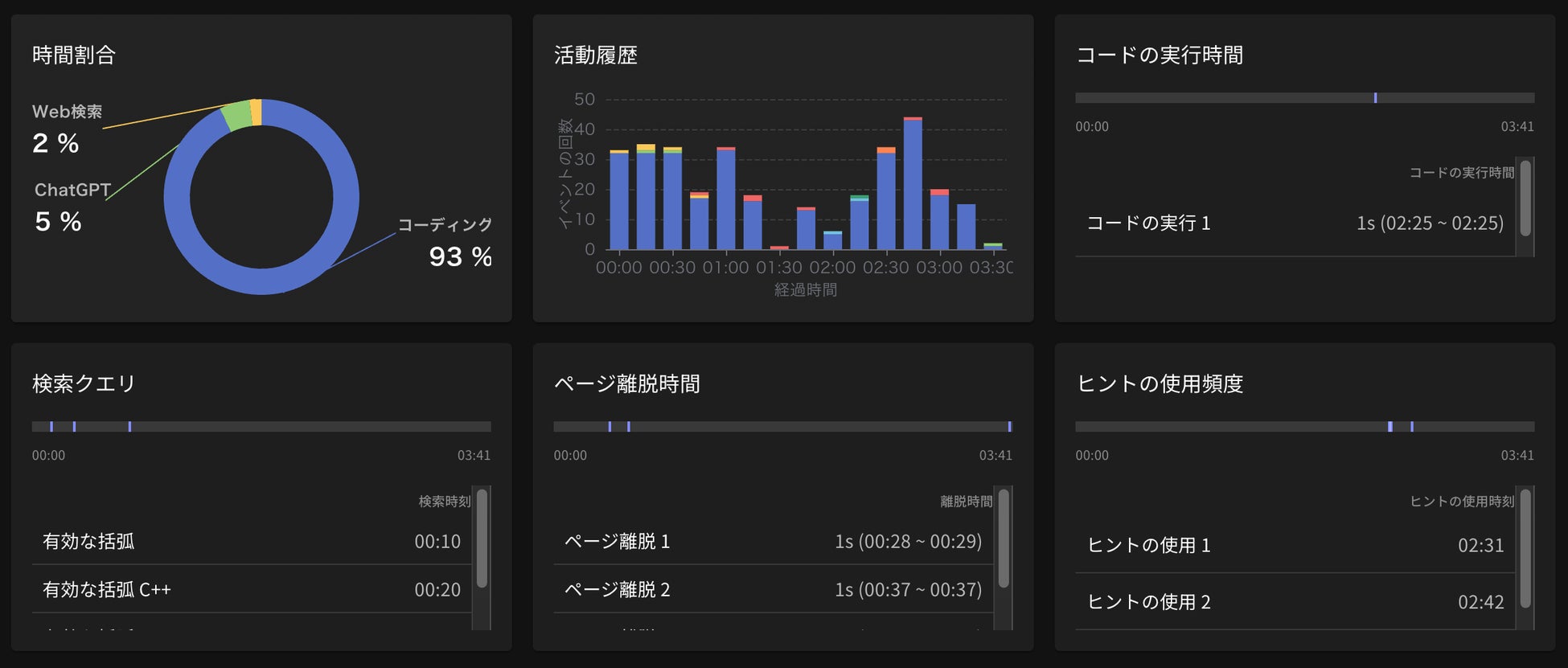 採用側は試験作成の時点でGoogle検索、ChatGPTの利用についてオン/オフ設定が可能です。候補者が試験の解答を終えると、Google検索、ChatGPTを活用した履歴をプレイバック機能で確認することができます。さらに、これらの統計情報を一目でみることができます。