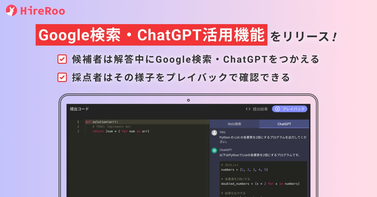 コーディング試験サービス『HireRoo(ハイヤールー)』( https://hireroo.io )を提供する株式会社ハイヤールー(本社:東京都渋谷区、代表取締役:葛岡宏祐)は、コーディング試験中にGoogle検索とChatGPTを活用できる機能をリリースいたしました。