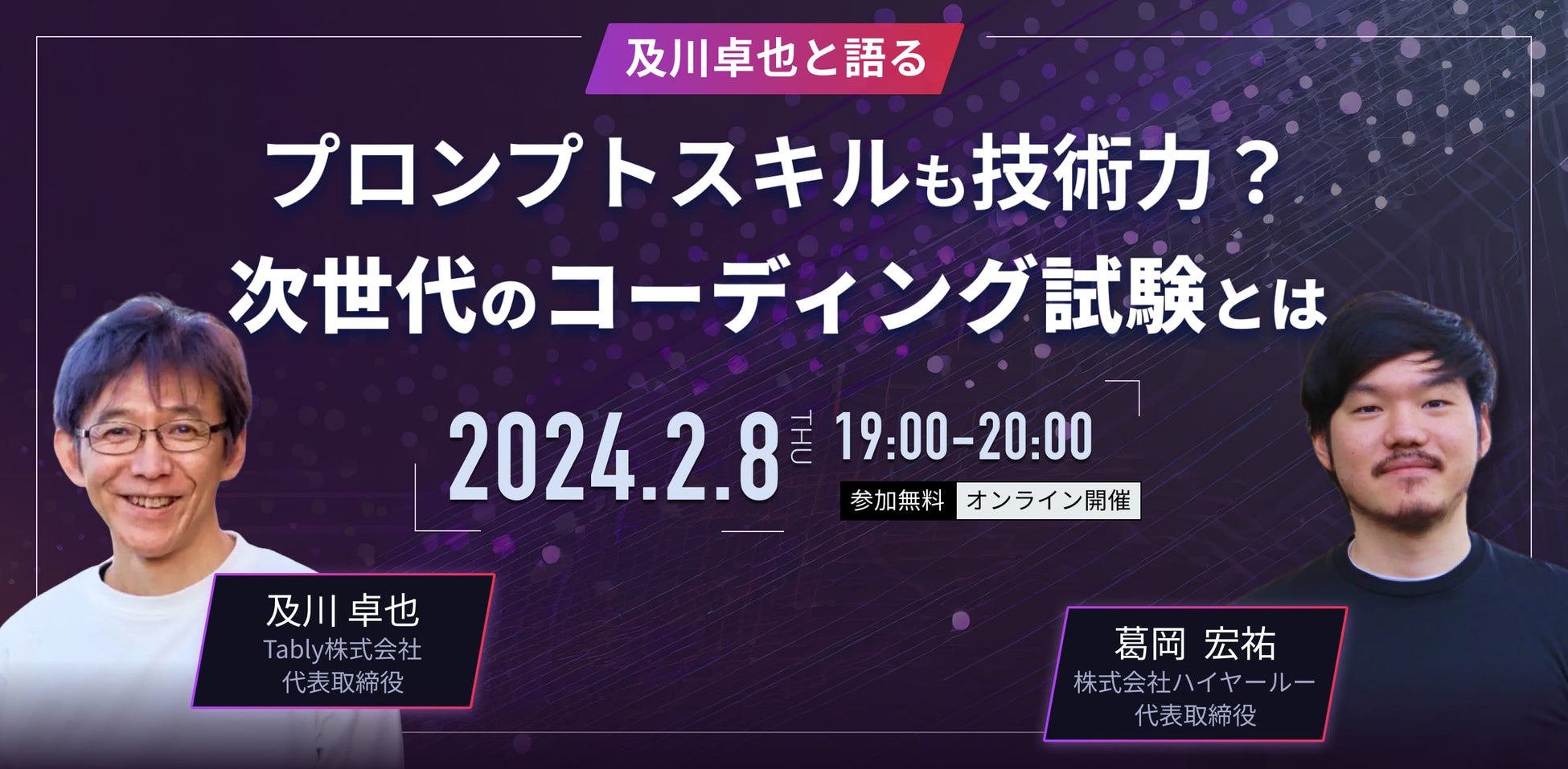 本セミナーでは、専門家から見たChatGPTの進化と、それに対するコーディング試験サービスの課題、さらにChatGPTを始めとする生成AIと共存し、コーディング試験を実現する方法についてパネルディスカッションを行います。お招きするのは、Tably株式会社 代表取締役の及川卓也氏です。