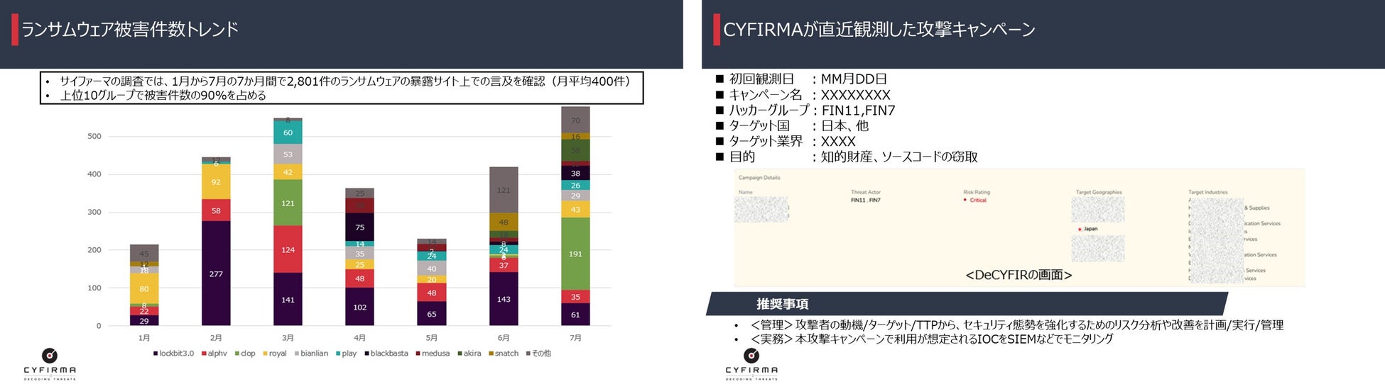 月次定例会を開催し、サイバー脅威の最新動向や、CYFIRMA社が観測した攻撃キャンペーンなどの外部脅威情勢の情報をご提供いたします。