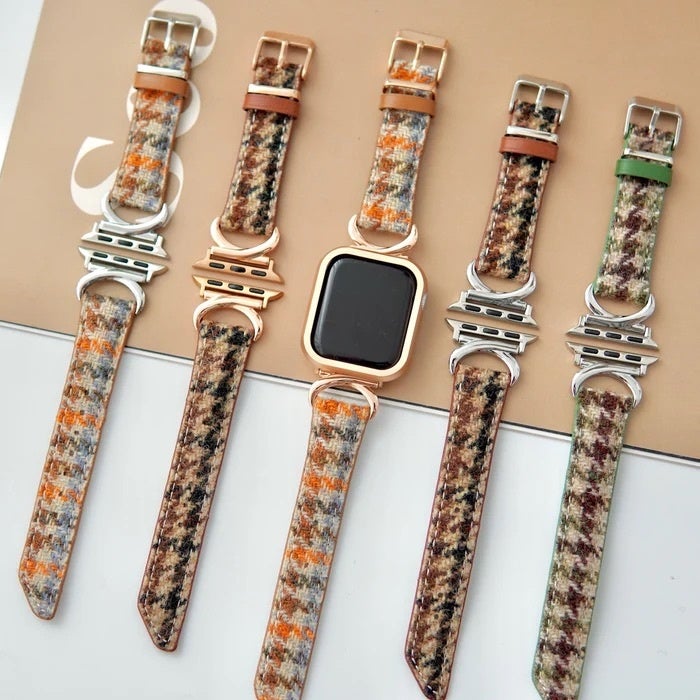 秋冬にぴったりのウールを使用したアップルウォッチバンドです。細かな千鳥柄がより季節感を引き立てます。裏側はPUレザー仕様で、ウールで起こりがちなチクチク感も気になりません。