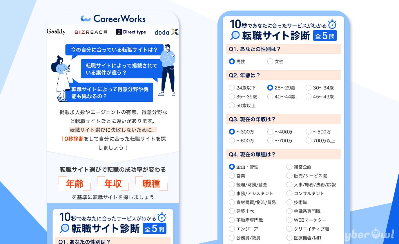 株式会社CyberOwl(本社:東京都渋谷区、代表取締役社長:田中啓太、読み:サイバーアウル、以下「当社」)は、2024年1月19日にあなたにぴったりな転職サイトが見つかるメディア「Career Works」(https://career-works.com/)をリリースしたことをお知らせいたします。