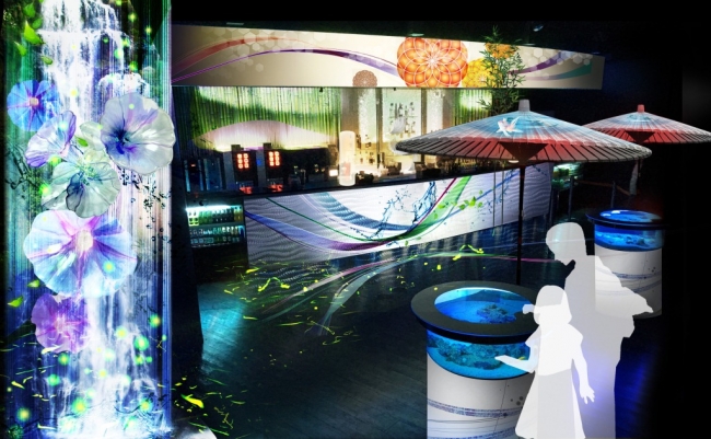 前のゾーン『水際花(すいさいか)』を抜けると、花びらが流れ込む川のマッピングが投影された階段が現れます。そして降りた先には、発光サンゴが展示される水槽があるカフェバー。流れ込むラインの連なり、舞い込む水滴と花びらなど“和モダン”の演出を施し、洗練された空間が広がります。柱には、手を触れると映像が動くインタラクションの仕掛けを施し、昼は花々が水辺に美しく咲き、夜はそこに蛍が 現れるなど、初夏の瑞々しさを演出します。(※)
