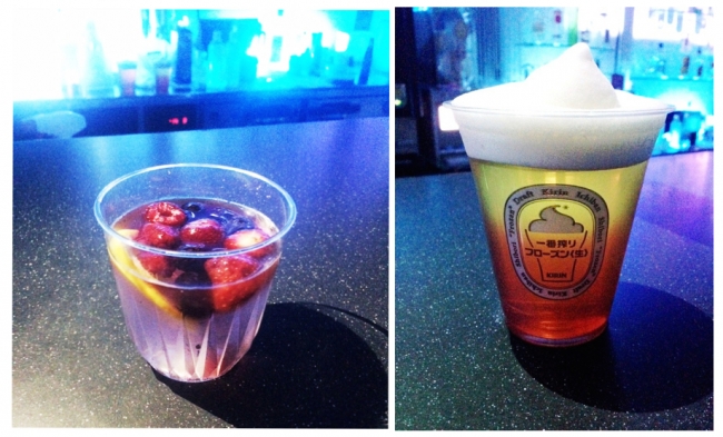 ジンベースにレモンソーダを入れてミックスベリーを浮かべた、艶やかなカクテル。②「花美 キリン一番搾りフローズン」