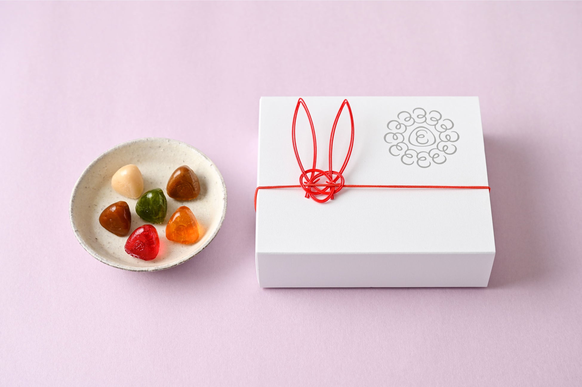 つやのある純白のボックスに2023年の干支であるうさぎに見立てた水引チャーム付きと、新年を祝うにふさわしい紅白カラーの仕立てです。