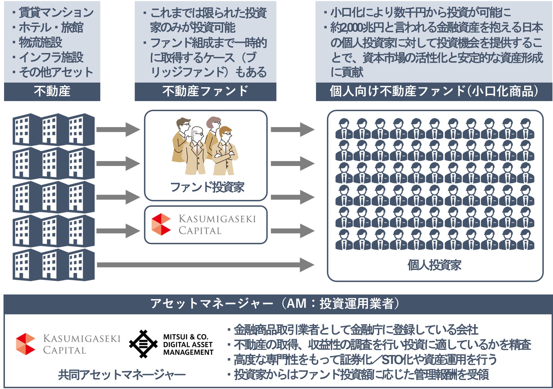 当社は、「その課題を、価値へ。」という経営理念のもと、社会の課題を解決する事業として、再生可能エネルギー発電施設、認可保育園、アパートメントホテル、物流施設、ヘルスケア関連施設の開発などを手掛けてまいりました。また、アセットマネージャー(投資運用業者)として不動産投資の証券化や運用資産の管理等を行ってきましたが、このたびMDMと共同で個人投資家へ投資機会を提供することを目的とした取り組みを新たに開始いたします。これまで、限られた投資家のみがアクセスできていた不動産投資ファンドをSTO(Security Token Offering)等のテック技術を活用することで、不動産デジタル証券ファンドとして個人投資家が投資しやすい形に整え、約2,000兆円と言われる金融資産を抱える日本の個人投資家に対して投資機会を提供する金融商品化を目指してまいります。