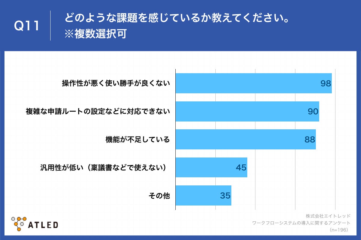 「Q11.どのような課題を感じているか教えてください。※複数選択可」と質問したところ、「操作性が悪く使い勝手が良くない」が98票で最多という回答となりました。