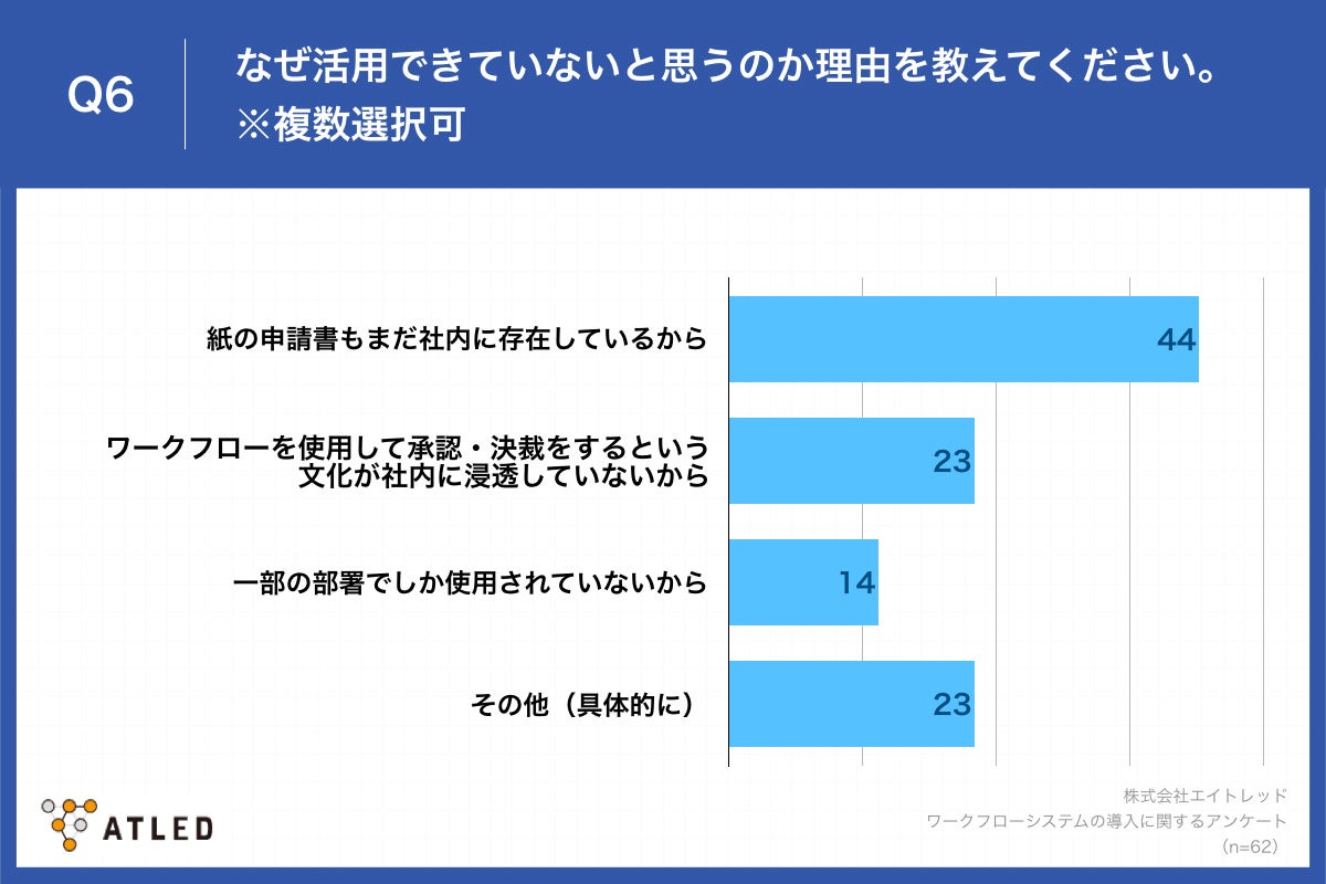 「Q6.なぜ活用できていないと思うのか理由を教えてください。※複数選択可」と質問したところ、「紙の申請書もまだ社内に存在しているから」が44票で最多という回答となりました。