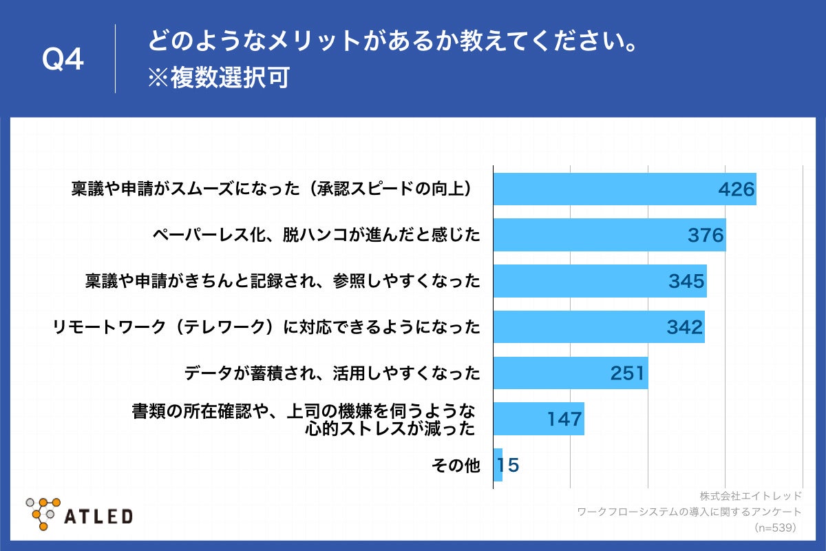 「Q4.どのようなメリットがあるか教えてください。※複数選択可」と質問したところ、「稟議や申請がスムーズになった(承認スピードの向上)」が426票で最多という回答となりました。