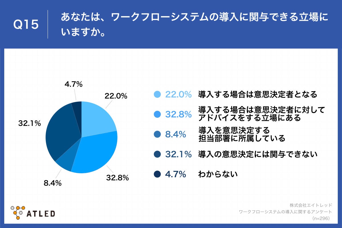 - ワークフローシステム未使用の企業において、回答者の約6割は「ワークフローシステムの導入」に関与できる立場