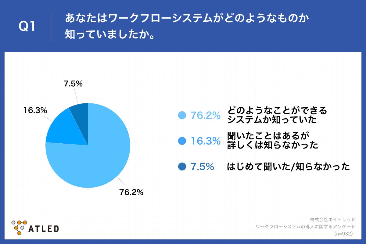 「Q1.あなたはワークフローシステムがどのようなものか知っていましたか。」と質問したところ、「どのようなことができるシステムか知っていた」が76.2%、「聞いたことはあるが詳しくは知らなかった」が16.3%という回答となりました。
