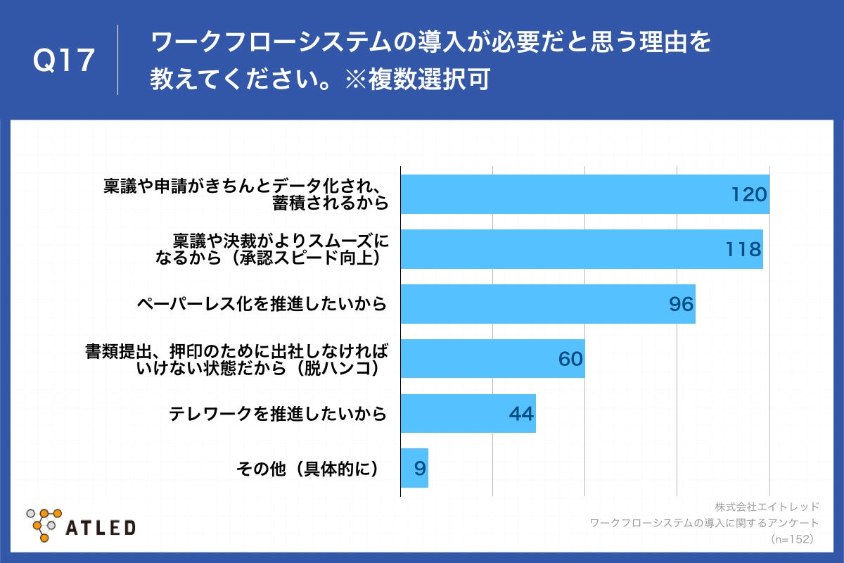 - ワークフローシステムの導入が必要な理由、「稟議や申請がきちんとデータ化され、蓄積されるから」(120票)や、「稟議や決裁がよりスムーズになるから(承認スピード向上)」(118票)など