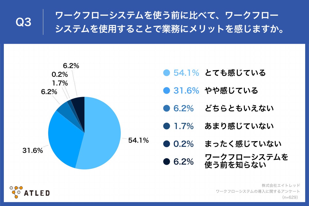 「Q3.ワークフローシステムを使う前に比べて、ワークフローシステムを使用することで業務にメリットを感じますか。」と質問したところ、「とても感じている」が54.1%、「やや感じている」が31.6%という回答となりました。