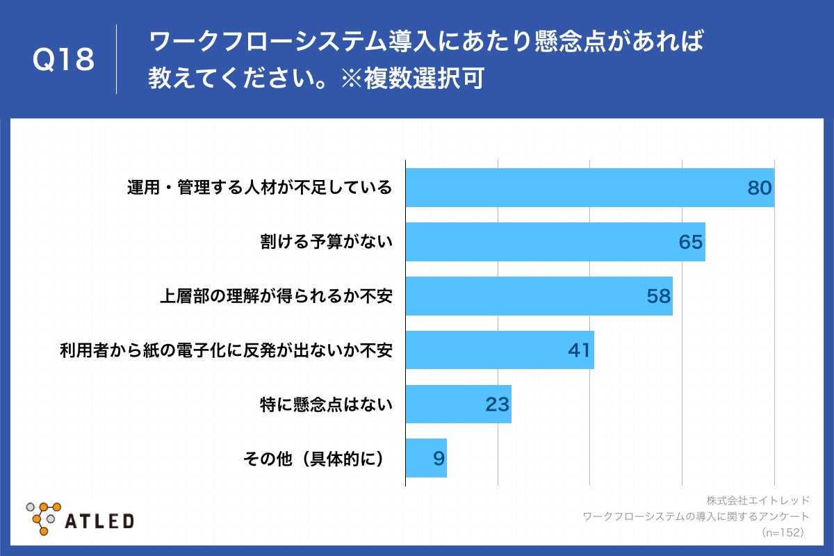 - ワークフローシステム導入の懸念点、「運用・管理する人材が不足している」が80票で最多