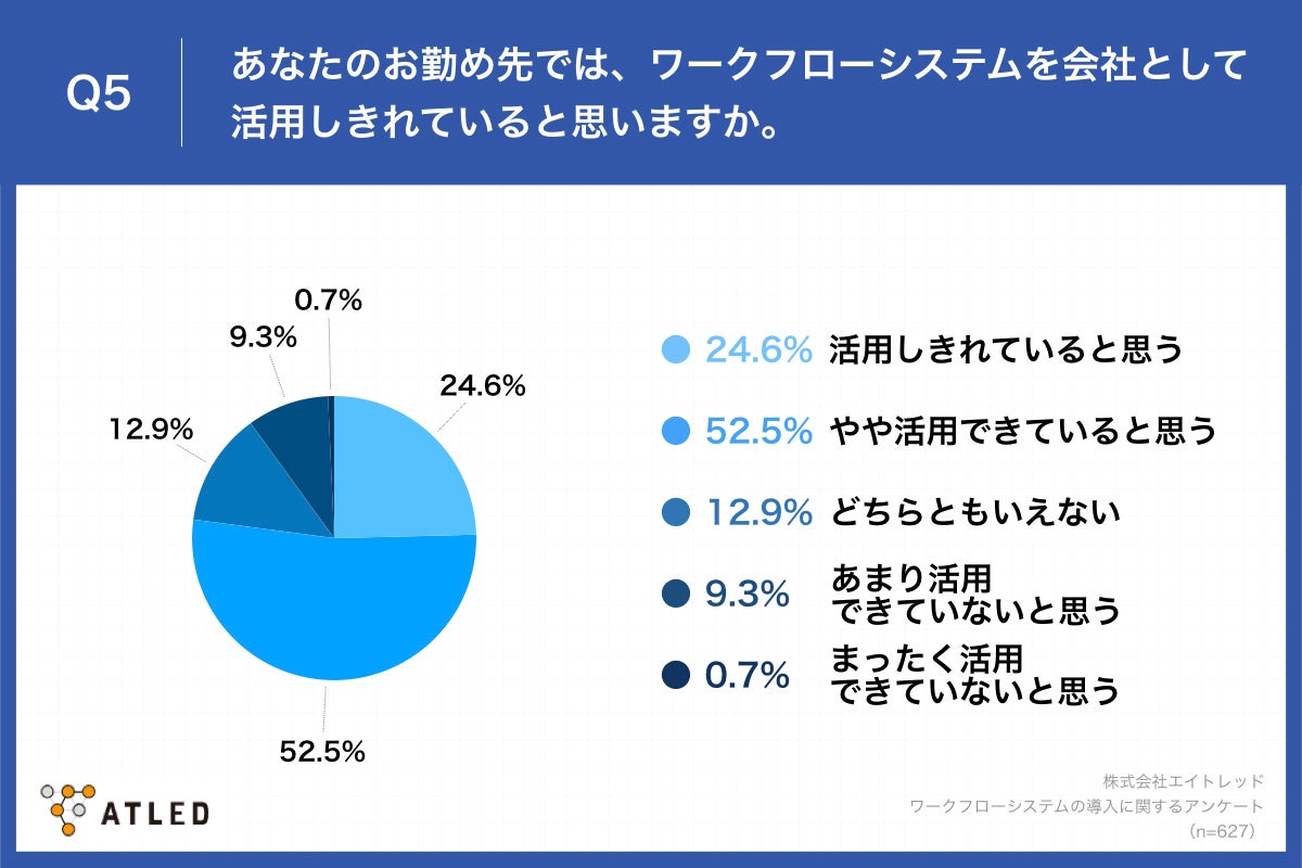 「Q5.あなたのお勤め先では、ワークフローシステムを会社として活用しきれていると思いますか。」と質問したところ、「活用しきれていると思う」が24.6%、「やや活用できていると思う」が52.5%という回答となりました。