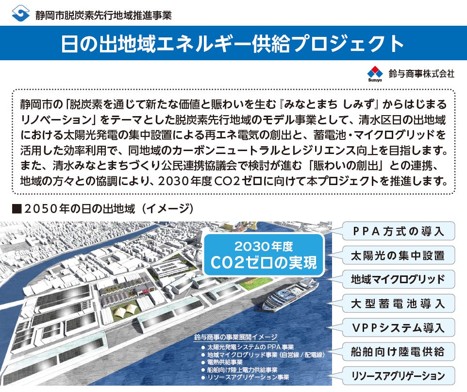 今回の取り組みは、鈴与グループの主要拠点である清水港の一角に位置する日の出地区において、居並ぶ倉庫の屋根等を最大限に活用した地域内の脱炭素化と、万が一の停電時でも事業活動等に必要な電力を確保する地域内のレジリエンス強化を、具体的な取組みの主眼に置いております。