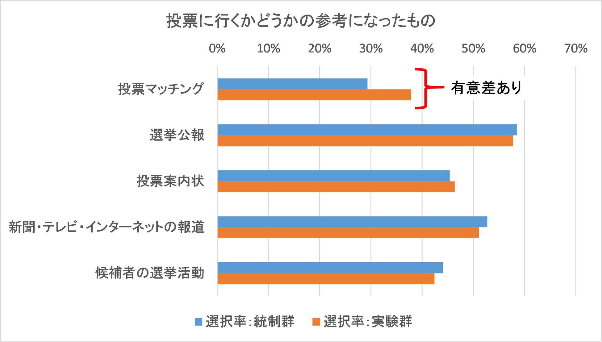 上記②と同様に、投票マッチングは候補者選びの参考にもなっています。マッチング結果を見ない統制群では32.3%が参考になったと回答したのに対して、マッチング結果を見た実験群では40.0%が参考になったと回答し、両者では統計的に有意な差がみられました。