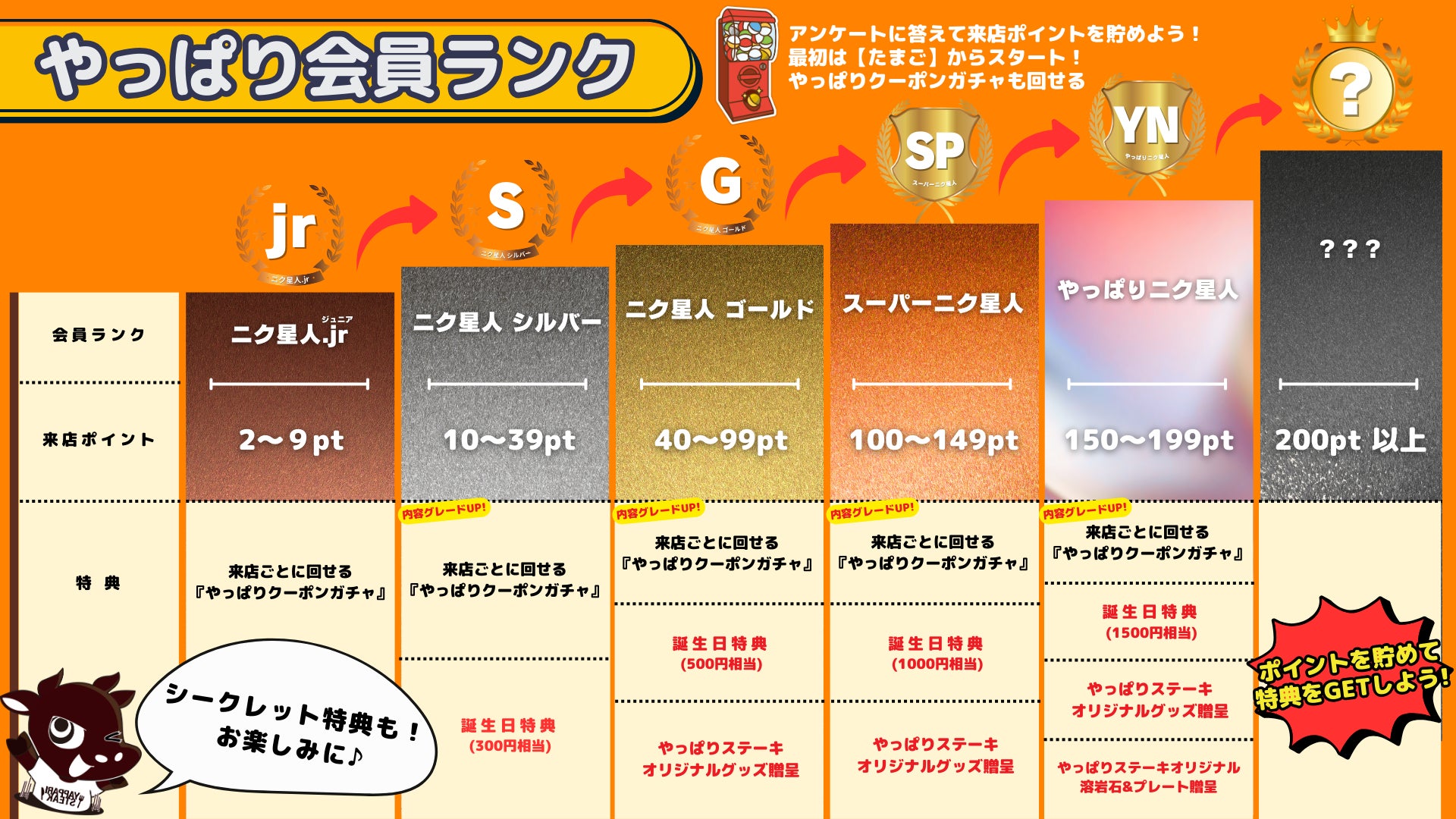 会員登録していただくと、来店ポイント1ptにつき1回まわせる『やっぱりクーポンガチャ』やランク別によってもらえる特典が付与されるようになるので、やっぱり会員へのご登録をお願いします!