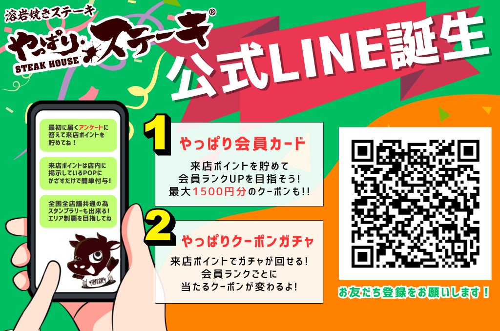 【最大1,500円分の特典も!?】 やっぱりステーキに全店舗共通の公式LINE登場! 全国共通の「やっぱり会員カード」や来店するたびに回せる無料クーポンガチャ機能などお得が盛りだくさん!