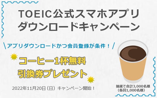 日本でTOEIC® Programを実施・運営する国際ビジネスコミュニケーション協会(IIBC)(所在地:東京都千代田区永田町、理事長:大橋圭造)は、スマートフォンアプリ「TOEIC®公式コンテンツ by IIBC」のダウンロードとTOEIC®申込サイトの会員登録をされた方に、抽選で合計3,000名にコーヒー1杯無料引換券が当たるキャンペーンを、2022年11月20日(日)から開始いたします。
