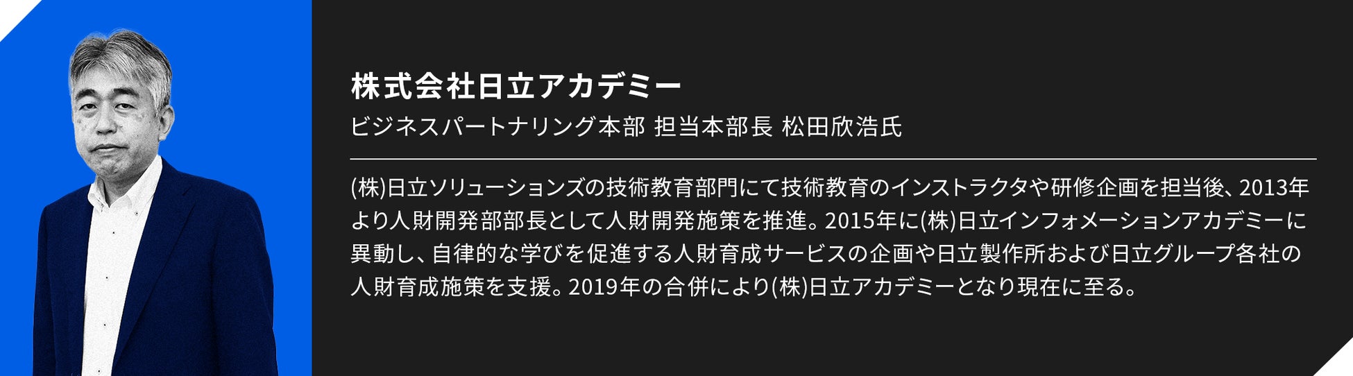 デジタルテクノロジーの急速な発展、DXによる産業構造の変化など、ビジネスを取り巻く環境は大きく変化しています。また、人生100年時代の到来、ジョブ型マネジメントへの転換など働く環境も変化しています。従業員一人ひとりがリスキリング・アップスキリングによりこの変化に対応していくことが重要です。日立におけるリスキリングの取り組みとして、デジタル対応力強化の一環として取り組んできたデジタルリテラシー向上施策や一人ひとりのキャリア志向に応じた自律的な学び・リスキルを支援する学習体験プラットフォーム(LXP:Learning Experience Platform)の活用についてお話しいただきます。