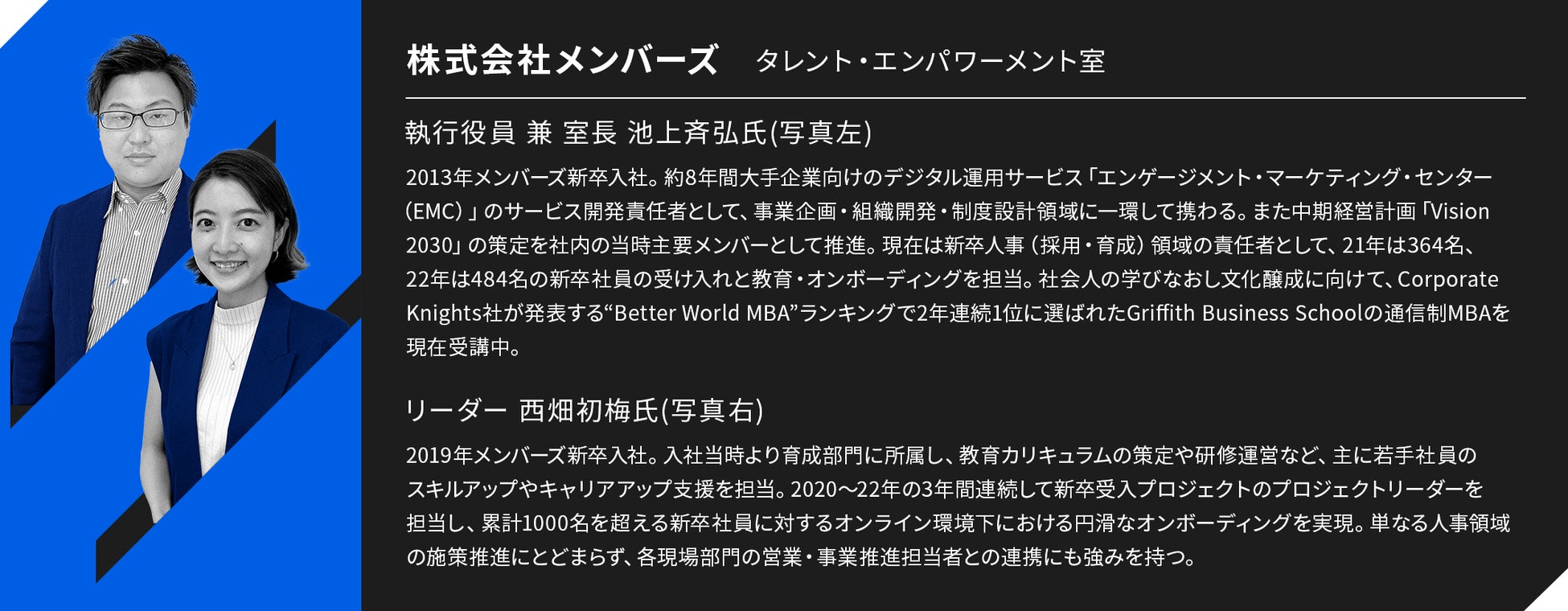 国内企業向けにデジタルマーケティング・ビジネスの運営支援事業を行うメンバーズでは、この数年で累計1,000名以上の新卒社員を採用し、専門スキルやマインド面の教育によって若手の主体的な成長と早期活躍を目指してきました。特にこの数年間は各事業部門の営業計画やサービス戦略との一貫性を意識した「オンボーディング」領域の強化に取り組んでいます。コロナ禍の影響を受け、オンラインを前提とする人事施策が求められる中、「人事担当者のあたかも出向」や「プロジェクト型集合研修」、「カンパニー長公募制度」等の具体的な取り組みや現状の課題感を皆さまにご紹介いただきます。