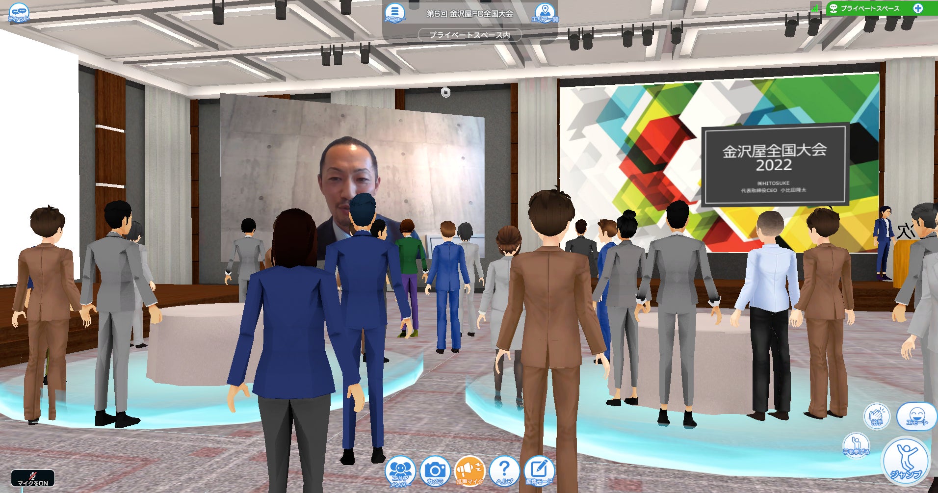 monoAI technology株式会社(本社:兵庫県神戸市、代表取締役社長:本城嘉太郎、モノアイテクノロジー、以下monoAI)は、株式会社HITOSUKE(本社:東京都中央区、代表取締役:小比田 隆太、以下HITOSUKE)が主催するイベント『家工房 全国大会』、『金沢屋 全国大会』にメタバース・プラットフォーム「XR CLOUD(エックスアールクラウド)」を提供いたしましたことをお知らせいたします。本イベントは「家工房」「金沢屋」の1年間の振返りと、フランチャイズ全加盟店が共通の価値観と方向性を持ち、チェーン全体のブランド力を強化していくことを目的に毎年開催しているイベントです。本年は新型コロナウイルスの感染拡大を防ぐため、メタバース空間での開催を実施、代表取締役 CEO小比田 隆太によるスピーチ、執行役員による年度の振り返り、加盟店オーナーの表彰者の発表などの催しを自宅に居ながら全国の加盟店との交流を楽しんでいただきました。