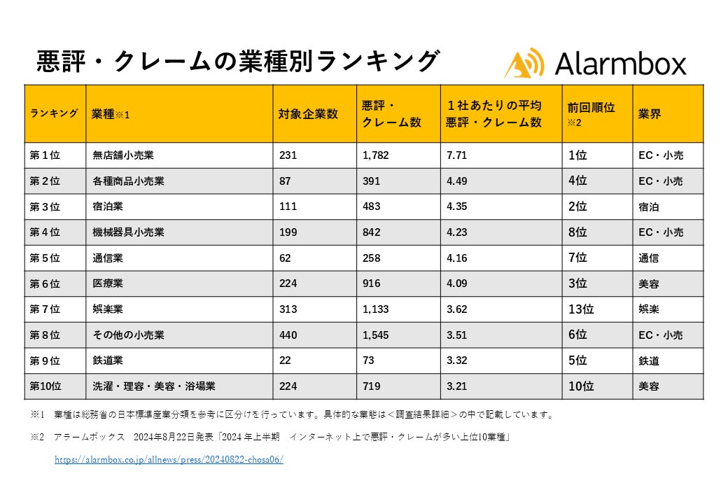 【2024年下半期 インターネット上で悪評・クレームが多い上位10業種を発表】11,957社のクレームを分析、EC・小売や宿泊、通信、美容が上位に