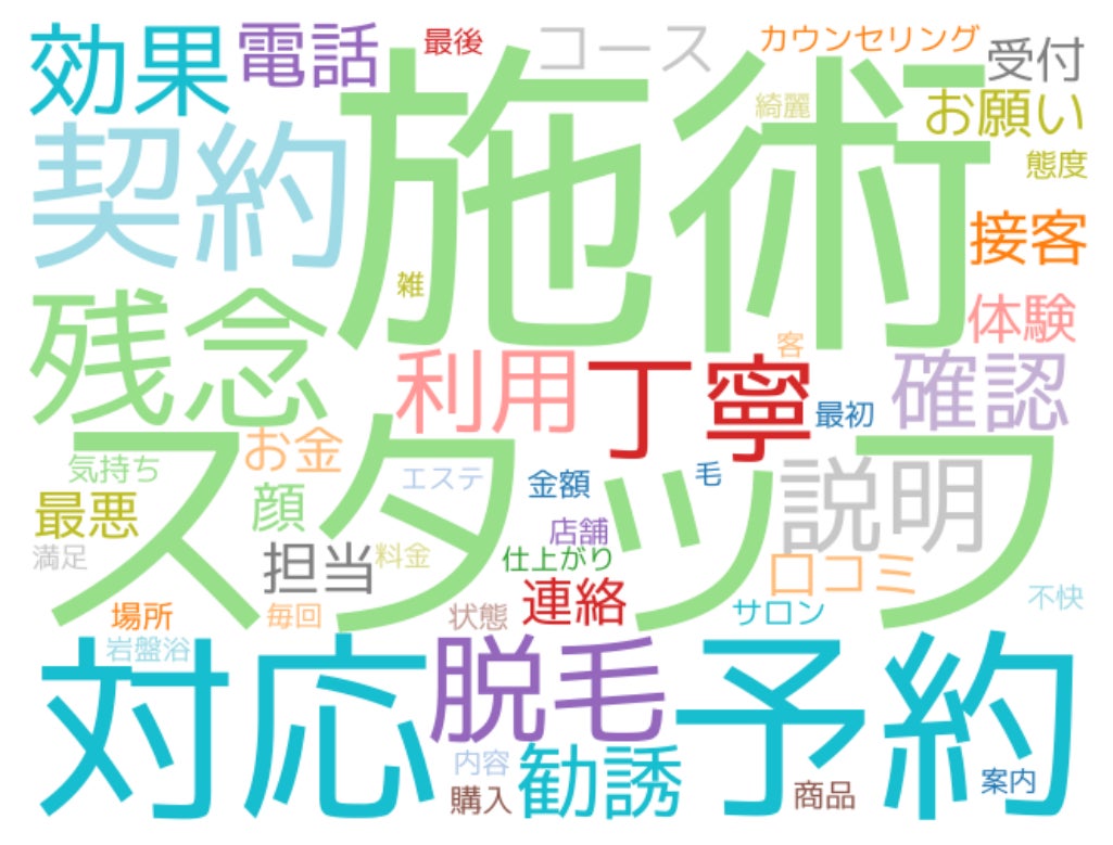 主にエステや脱毛サロン、美容院に対して、スタッフの対応、施術、予約・スケジュールに関するクレームが多く見られました。スタッフ対応では、接客態度が冷たく説明が十分でない、問い合わせへの対応が適切でないといったクレームが多くなっていました。施術に関しては、脱毛や美容施術の効果を実感できない、痛みや肌トラブルが生じる、ヘアカットの仕上がりが希望と異なるといった不満が見受けられました。予約・スケジュールでは、予約の取りづらさや来店後長時間待たされたことなどがクレームに繋がっていました。特に脱毛サロンでは、突然の廃業により費用を支払ったのに施術を受けられなかったトラブルが発生しており、きちんと施術が受けられるのか不安視する声も見受けられました。