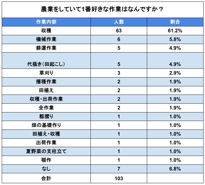 「農業をしていて1番好きな作業はなんですか?」(n=103)と生産者様に質問したところ、「収穫」と回答した方が63名と全体の61.2%を占めました。次いで「機械作業」と回答した方が6名(5.8%)という結果となりました。