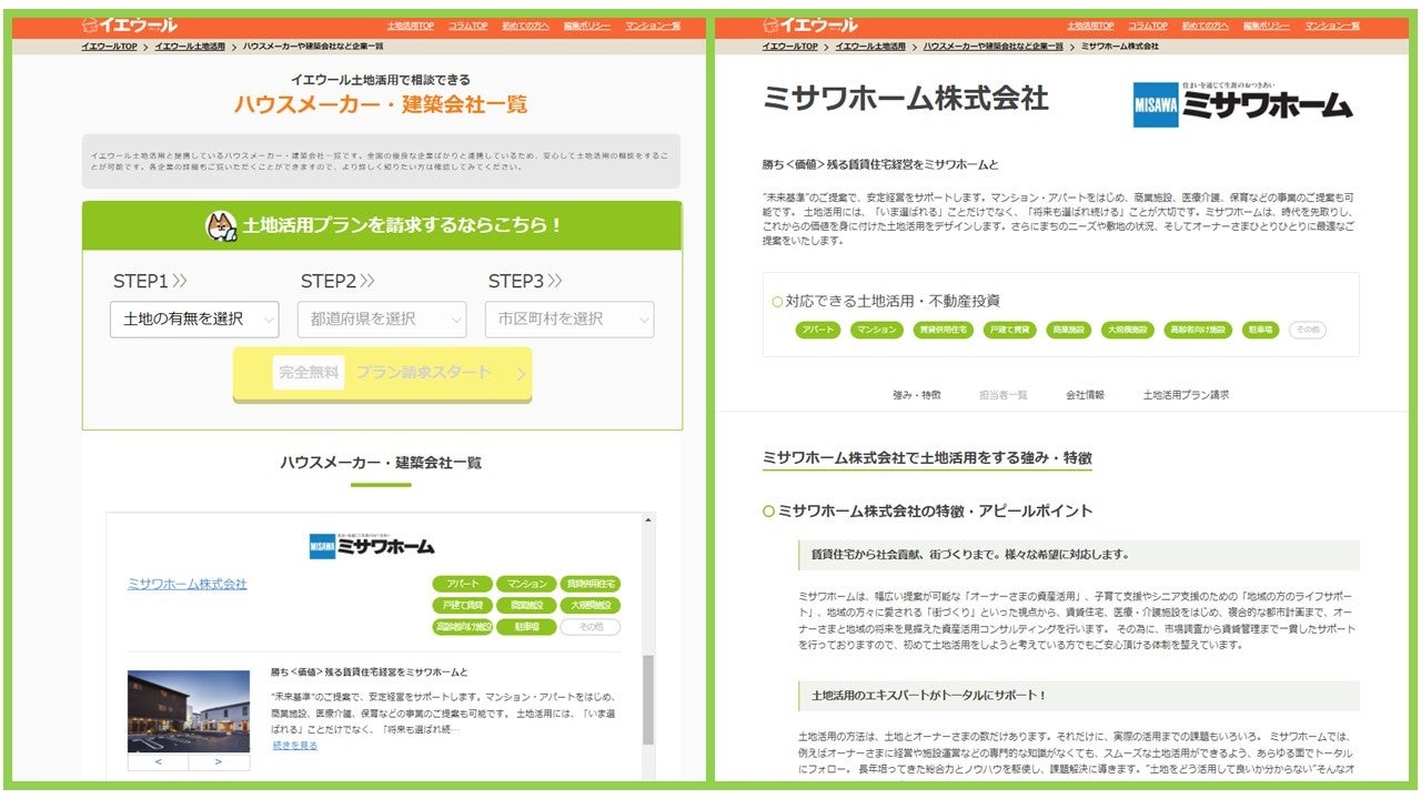 企業ページは、イエウール土地活用と提携している企業の特徴や強み、建築プランなどを紹介しているページです。